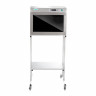 металлического корпуса (с внутренним и внешним полимерным порошковым лакокрасочным покрытием) с прозрачной дверцей (тонированное стекло) полностью задерживающей УФ-излучение, закрепленного на передвижной тележке;